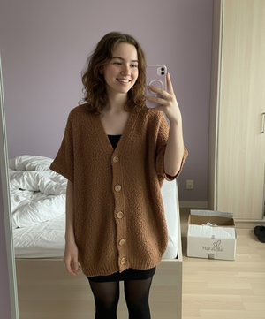 Man ļoti patīk šis apģērba gabals – tas ir kvalitatīvs un adījums ļoti ērts. Piegriezums kopumā ir ideāls. Vienīgā nelielā piezīme – tas ir nedaudz par īsu manai augumam.